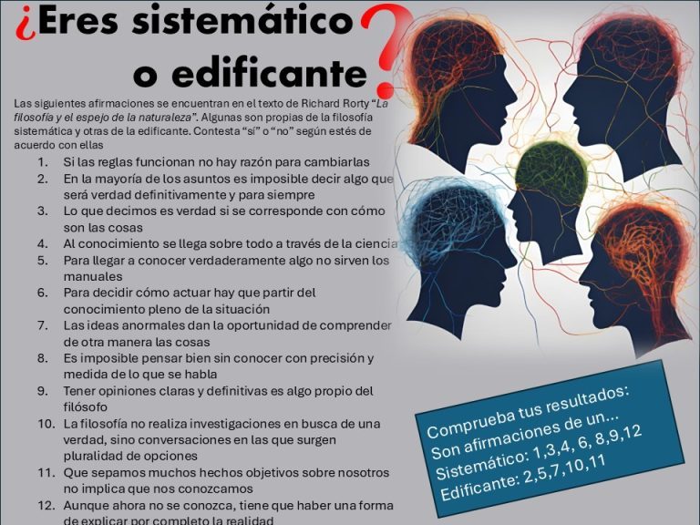 El siguiente test está elaborado con afirmaciones de Richard Rorty en su libro La filosofía y el espejo de la naturaleza. Algunas de ellas son propias de una filosofía sistemática mientras que otras lo son de una edificante. En realidad es posible hacer un diálogo filosófico a partir de todas ellas, pero este formato de test nos permite «tomarnos el pulso» saber un poco qué tipo de autores nos gustarán más, o que forma de filosofar es más cercana a nosotros.
