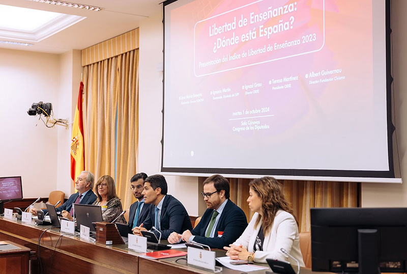 El informe analiza el pluralismo educativo en 157 países equivalentes al 98% de la población mundial y ha sido presentado por Ignasi Grau, director de Oidel, Teresa Martínez, presidenta de esta ONG, Albert Guivernau, director de Fundación Civismo e Ignacio Martín, diputado del Grupo Parlamentario Popular.