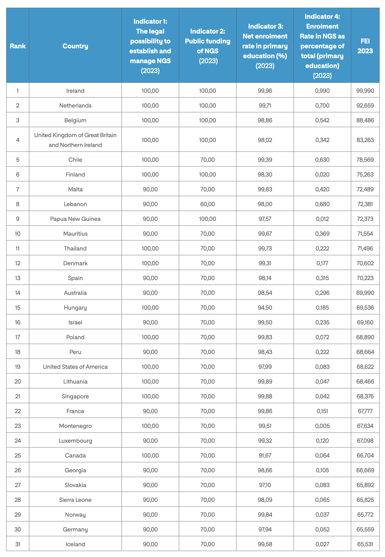 Para la elaboración del índice se han tenido en cuenta indicadores como la posibilidad legal de establecer o administrar escuelas no gubernamentales, la financiación pública de estos colegios, la tasa de matriculación en estos centros y la tasa de matriculación en relación con el porcentaje total en educación primaria.