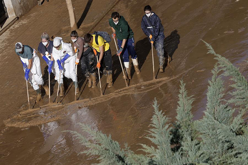 Decenas de voluntarios continúan extrayendo lodo de las calles, este domingo, en la población de l`horta Sud de Catarroja. © EFE / Miguel Ángel Polo