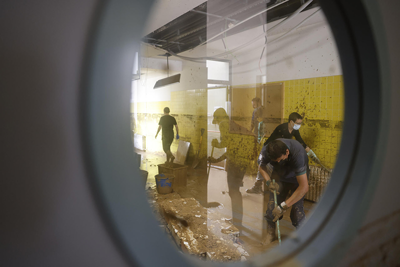 Varias personas trabajan en las labores de limpieza del lodo en un colegio de Sedaví, Valencia, este lunes. © EFE/Ana Escobar