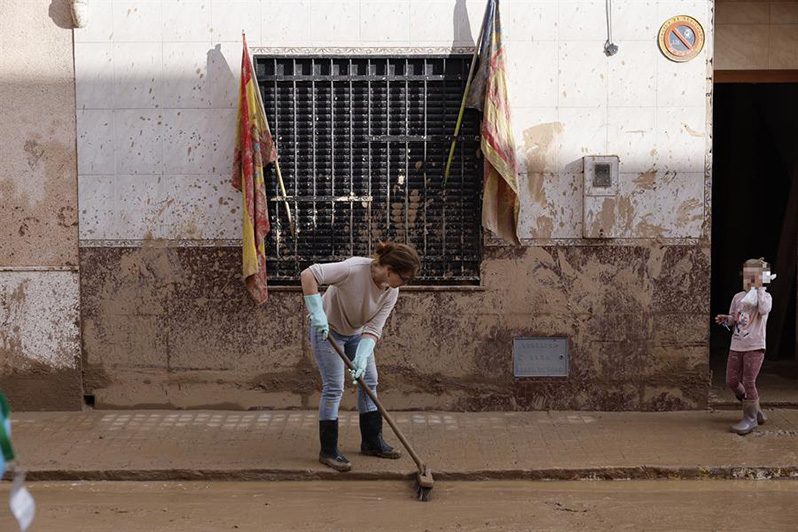 Una mujer limpia las calles en Masanasa (Valencia) este jueves. Los pueblos de Valencia asolados por la DANA afrontan el noveno día después de la catástrofe sumidos en un goteo incesante de llegada tanto de ayuda humanitaria como profesional y de maquinaria pesada, para intentar recuperar infraestructuras, colegios, zonas industriales y vías de comunicación mientras continúa la búsqueda de desaparecidos. © EFE/Kai Försterling