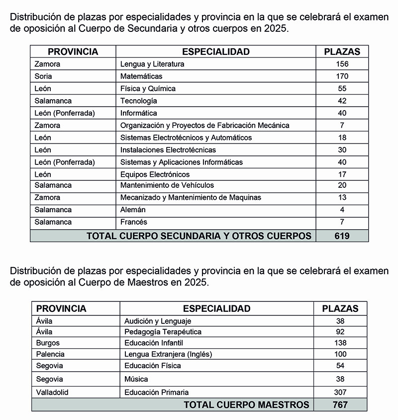 También se han dado a conocer las de profesores especialistas en sectores singulares de Formación Profesional: Mantenimiento de Vehículos (20 plazas), con exámenes en Salamanca, y Mecanizado y Mantenimiento de Máquinas (13), cuyas pruebas se realizarán en Zamora. Finalmente, en Escuelas Oficiales de Idiomas, los procesos que también empezarán el próximo mes de junio afectan a las especialidades de Alemán (4 plazas) y Francés (7 plazas), cuyos exámenes tendrán lugar en Salamanca en ambos casos. El plazo de presentación de solicitudes se abrirá a mediados de enero.