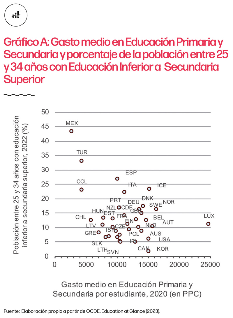 La edición 2024 de Indicadores comentados sobre el estado del sistema educativo español incluye tres gráficos relacionados con la situación y evolución del gasto en educación, el 38, el 39 y el 40. Para este comentario y utilizando datos para la OCDE tomados de Education at a Glance 2023, en el gráfico A se muestra la relación entre el gasto medio por estudiante en Educación Primaria y Secundaria, corregido por diferencias de poder adquisitivo, y el porcentaje de la población entre 25 y 34 años con un nivel de estudios por debajo de la Educación Secundaria Superior. La comparación es bastante ilustrativa: no se observa correlación alguna entre ambas variables a partir de un gasto superior a 5.000 dólares anuales por estudiante. España tiene un nivel de gasto similar al de Polonia, República Checa o Eslovenia, y superior al de Letonia, Lituania o Eslovaquia, pero obtiene peores resultados educativos en cuanto al porcentaje de población con estudios de al menos Secundaria Superior.