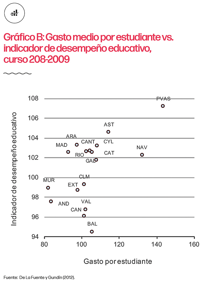 Trabajando con datos a nivel de CC. AA. de de la Fuente y Gundín (2012), el gráfico B ilustra la relación entre el gasto medio por estudiante (en Educación Primaria y Secundaria) y un indicador de resultados que tiene en cuenta diversas dimensiones de desempeño educativo, desde la facilidad de acceso hasta el nivel de competencias adquirido. El mensaje es similar al del gráfico A: la relación entre gasto y desempeño no está muy clara en el mejor de los casos. Con un nivel de gasto parecido, Asturias era la segunda comunidad con mejor desempeño educativo, mientras Baleares se encontraba en la cola.