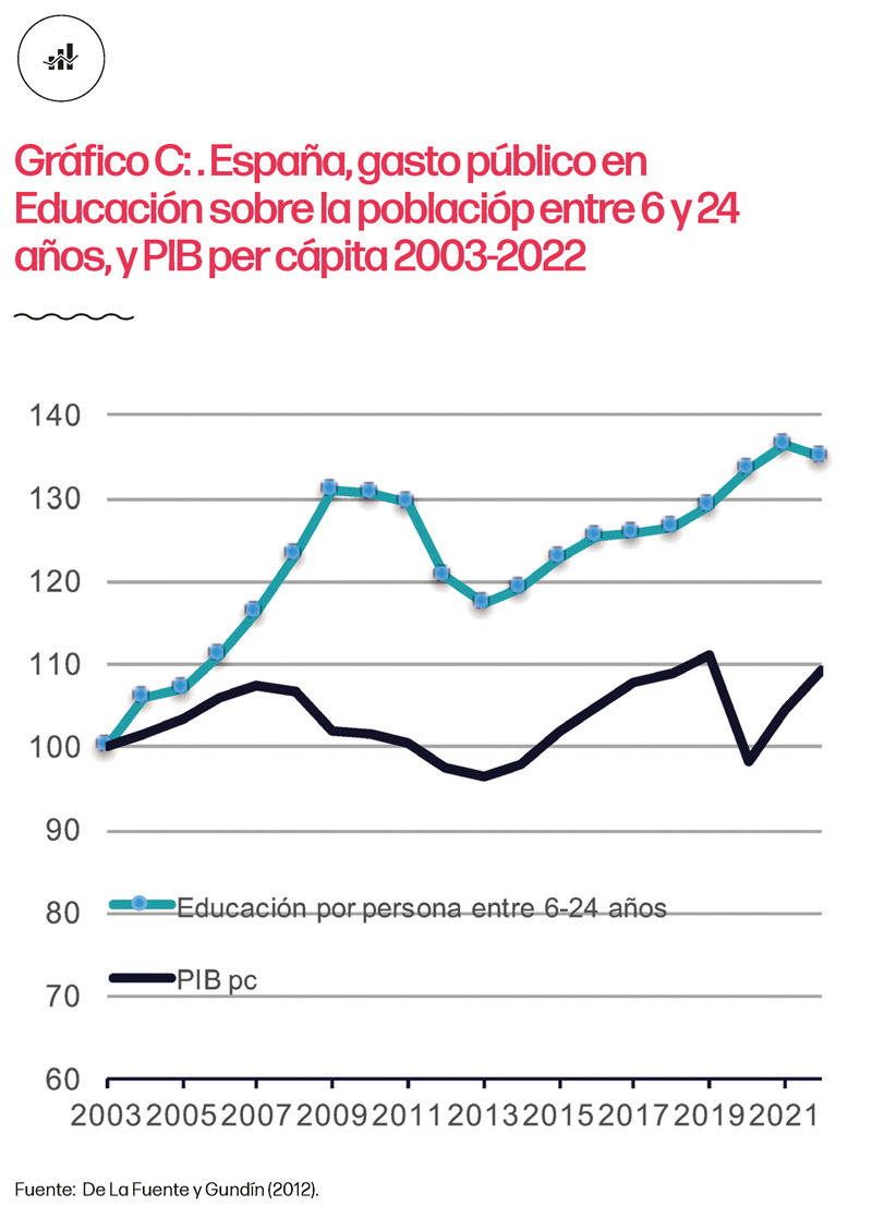 Expresar el gasto en educación por estudiante no solo es útil a la hora de realizar comparaciones internacionales, sino que también lo es para valorar su evolución temporal porque, a diferencia de la ratio de gasto sobre PIB, este indicador tiene en cuenta los cambios en la estructura demográfica y, en particular, el peso de la población en edad escolar y universitaria. Con datos actualizados de la Intervención General de la Administración del Estado y la población entre 6 y 24 años, en el gráfico C se observa que el gasto público no financiero en educación en 2022 era un 35,2% superior al de 2003 en términos reales, mientras el PIB per cápita ha aumentado sólo un 9,5%, casi cuatro veces menos. A pesar de este aumento del gasto público en educación por estudiante, los resultados de PISA de 2022 son ligeramente inferiores a los de 2003, en las tres competencias analizadas en el informe (Matemáticas, Lectura y Ciencias).