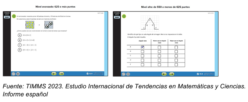 A diferencia de PISA, que evalúa competencias, TIMSS se centra en contenidos más “curriculares”. Decimos “curriculares” entre comillas porque los ítems se alinean mucho con lo que aparece en los libros de texto más habituales y porque el currículo cambia de unos países a otros. Merece la pena saber qué está evaluando TIMSS. Aquí mostramos dos de los ítems que aparecen de ejemplo en el informe español, como representativos de nivel avanzado (izquierda) y alto (derecha).