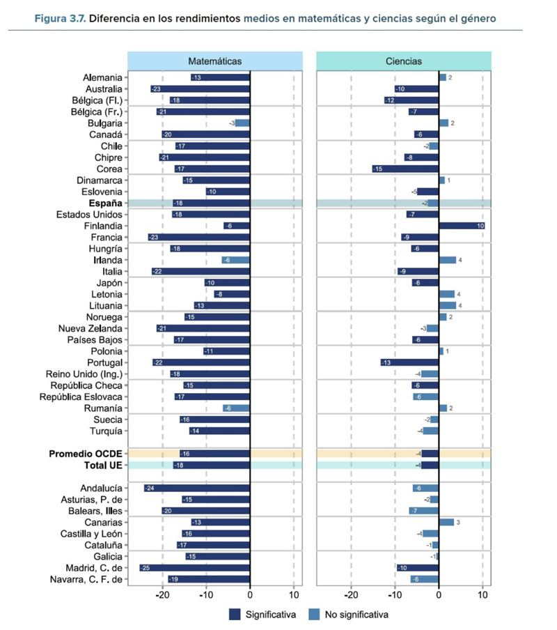 Vayamos ahora a algunas conclusiones interesantes. Por ejemplo, sobre la brecha de género. En todos los países de la gráfica del informe español (en el informe completo, hay cinco países que se salvan), el rendimiento en matemáticas es mejor en los chicos que en las chicas.