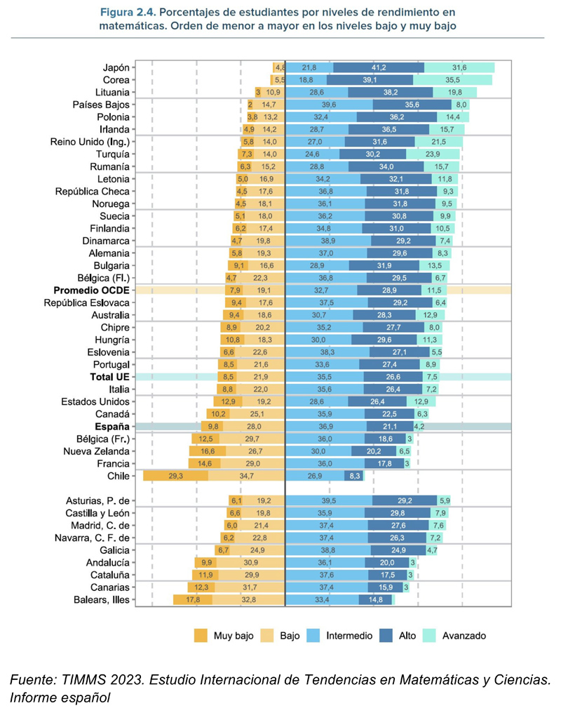En el informe TIMSS 2023 sale un porcentaje muy similar de alumnado que está en el nivel intermedio o superior, aproximadamente el 60 %. Sin embargo, este dato no hay que leerlo así, sino al revés, porque quiere decir que casi un 40 % del alumnado está en los niveles bajo o muy bajo. Esto también requeriría de medidas de acción inmediatas, y ya adelanto que el Plan de refuerzo de matemáticas y lectura que está en marcha se queda muy corto.
