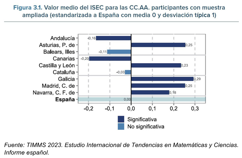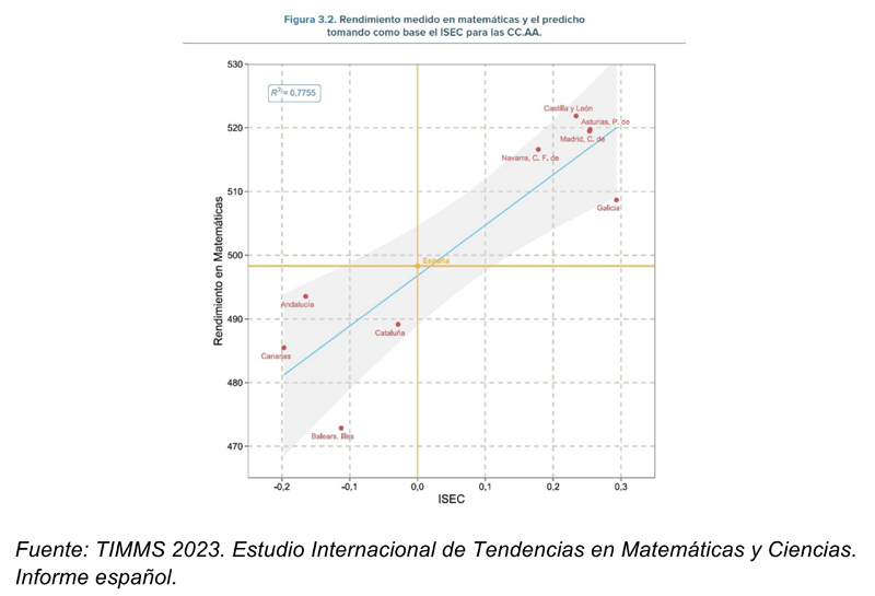 Si la cuestión de género no sorprende a nadie, la correlación entre índice socioeconómico y rendimiento en matemáticas en TIMSS tampoco. Propongo a los lectores el ejercicio de predecir, fijándose en esta gráfica, que indica el valor medio del índice socioeconómico (ISEC) para las comunidades participantes en el estudio, cuáles fueron las comunidades con mejores resultados.