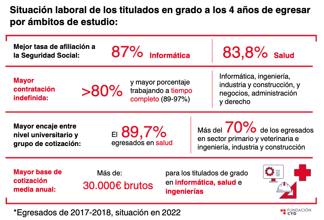 En el Informe CYD también se reflejan los mejores resultados en cuanto a inserción laboral de los recién titulados en grado, siendo estos Informática, Salud y Servicios Sociales, e Ingeniería Industrial y Construcción. Las mejores cifras, en cuanto a las tasas de afiliación a la Seguridad Social, se dan en Informática y Salud, mientras que las menos favorables corresponden a Ciencias Sociales, Periodismo y Documentación (70,4%) y Artes y Humanidades (63,8%).