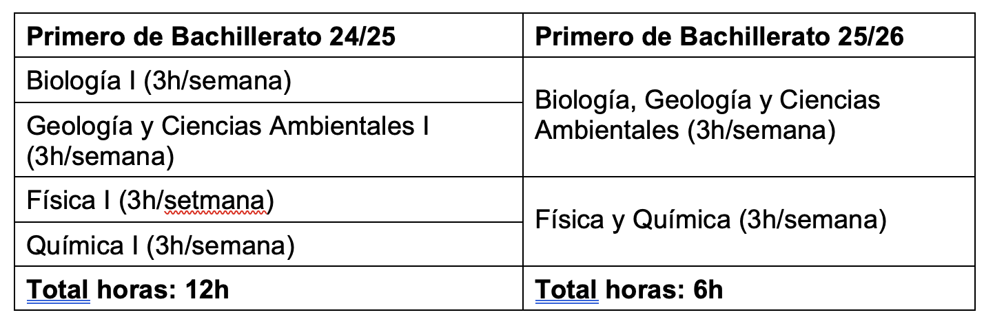 El cambio más importante afecta al primer curso de Bachillerato de la modalidad de ciencias y tecnología, y consiste en unir la materia “Biología I”, que ocupa 3 horas a la semana, con la materia “Geología y Ciencias Ambientales I” que también ocupa 3 horas a la semana, en una sola materia denominada “Biología, Geología y Ciencias Ambientales” que solo ocupa 3 horas a la semana. También implica unir la materia “Física I”, que ocupa 3 horas a la semana, con la materia “Química I”, que también ocupa 3 horas a la semana, en una sola materia denominada “Física y Química” que solo ocupa 3 horas a la semana. Así pues, este cambio comporta que el profesorado de estas cuatro ciencias pasaría de impartir 12 horas de clase a los alumnos de un grupo, si unos han escogido unas materias y otros han escogido otras y entre todos han escogido estas cuatro materias, a solo darles 6 horas de clase, como se puede ver en el siguiente cuadro: