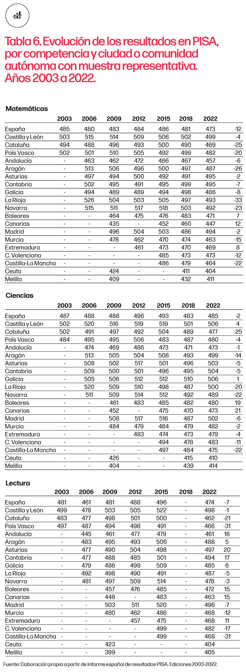 En España, las competencias educativas han sido traspasadas a las comunidades autónomas (CC.AA.) y, por tanto, son éstas las responsables del proceso de producción educativo y del diseño de la mayor parte de políticas. Como consecuencia, conocer la realidad del sistema educativo español requiere analizar y comparar la realidad de cada una de sus regiones. El análisis de los resultados de la edición 2022 del Programme for International Student Assessment (PISA) por CC. AA. pone de manifiesto la existencia de importantes diferencias tanto en términos de rendimiento como de equidad educativa (1) . La tabla 6 muestra el rendimiento por competencias del alumnado español desde 2003, primera ola de PISA para la que se dispone de muestras representativas para diversas CC. AA. 2015 fue la primera ola para la que se dispuso de dichas muestras para todas las CC. AA.