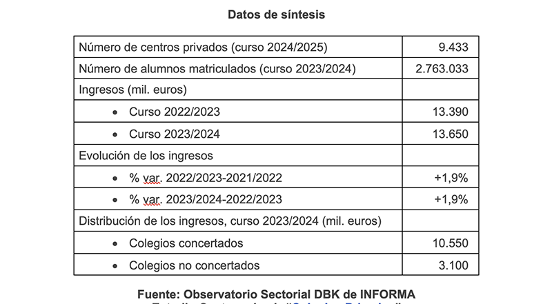 Según el Observatorio Sectorial DBK de Informa, los ingresos de los colegios privados alcanzaron los 13.650 millones de euros en el curso 2023-24, con un incremento del 1,9% respecto al curso anterior, en el que había mostrado un comportamiento similar. Esta evolución reflejó cierta desaceleración en el crecimiento, tras las tasas de alrededor del 5% contabilizadas en los cursos 2020-21 y 2021-22.