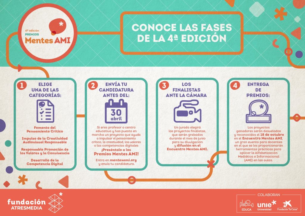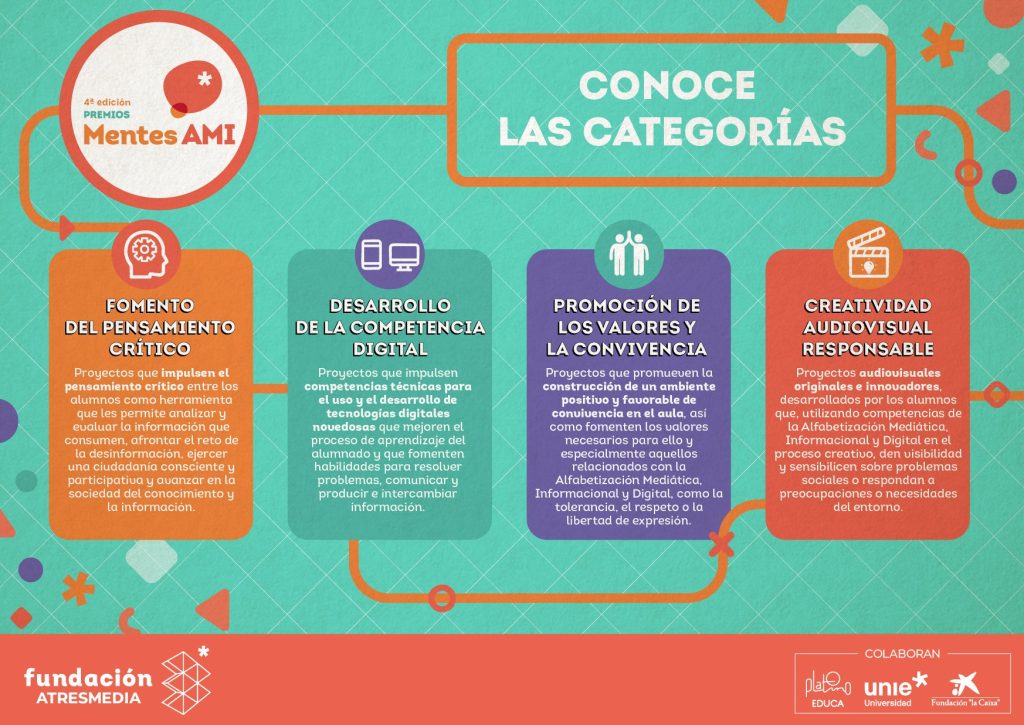 La Fundación Atresmedia arranca la 4ª edición de los Premios Mentes AMI, una iniciativa que cuenta con la colaboración de Platino Educa, UNIE Universidad y la Fundación «la Caixa». Así, abre el plazo para presentarse a esta convocatoria que busca promover, reconocer y dar visibilidad a proyectos educativos que impulsan las competencias mediáticas, informacionales y digitales en el entorno escolar, centrándose en el fomento del pensamiento crítico, la creatividad audiovisual responsable, los valores y convivencia y las competencias digitales.