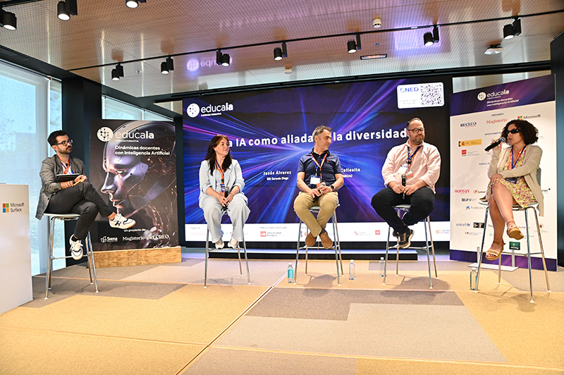 La tercera ponencia fue dedicada a todos aquellos estudiantes con necesidades especiales que requieren de otras estrategias educativas, y cómo el uso de la IA puede ayudar a implementar estas medidas. El debate contó con las intervenciones de Leopoldo Callealta (UNIE), Sara Martínez (Bentónico), Lourdes González (Fundación ONCE) y Jesús Álvarez (IES Gerardo Diego, Pozuelo de Alarcón, Madrid).