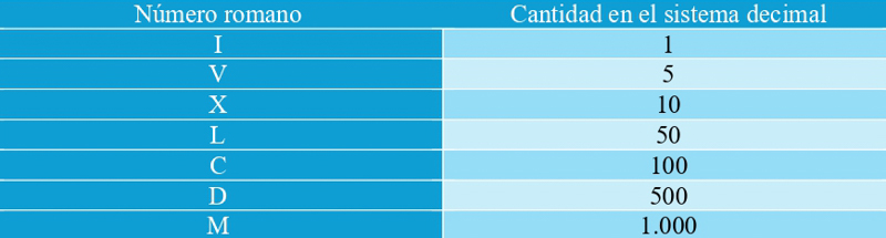 Cada número romano corresponde con una cantidad. Vamos a descifrar los números del sistema decimal a los que equivale cada uno de ellos en la siguiente tabla.