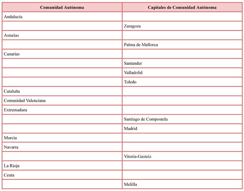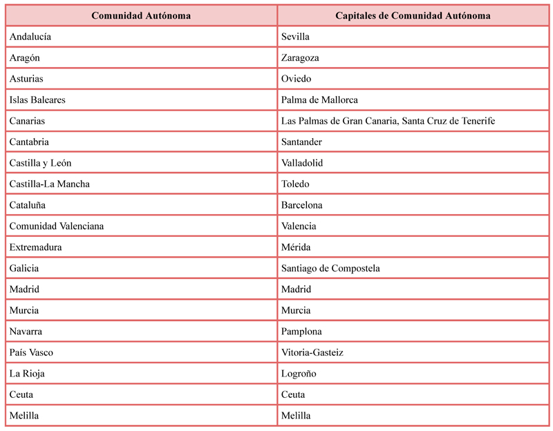 En España existen 17 comunidades y dos ciudades autónomas distribuidas por la península ibérica, el archipiélago canario, balear y en el continente africano. Aquí te dejamos una tabla con las comunidades autónomas y sus capitales.
