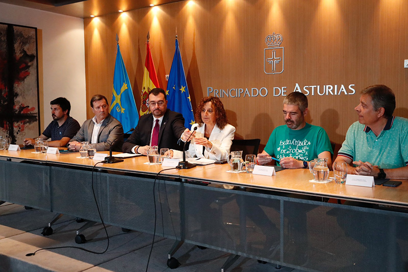 En la imagen (de izqda. a dcha.): el secretario de Suatea, Miguel Laria; el presidente de ANPE, Gumersindo Saiz; el presidente del Principado, Adrián Barbón; la consejera de Educación, Eva Ledo; el secretario general de CCOO, Borja Llorente; y el secretario general de UGT, Cristóbal Puente.