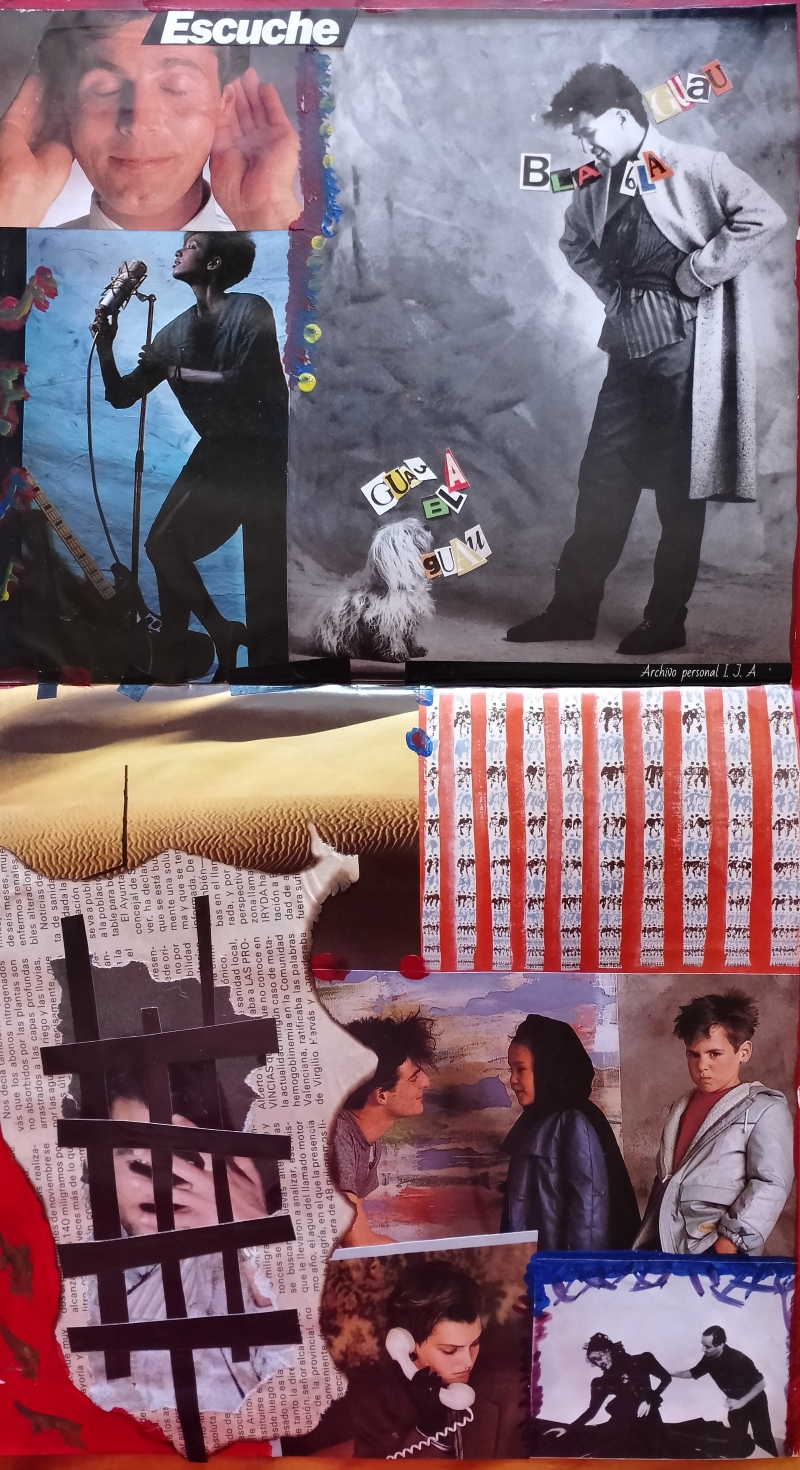 Si se pone en común el trabajo realizado, podríamos plantear preguntas como ¿por qué has recortado esta imagen?, ¿por qué has dibujado el fondo con estas formas?, ¿por qué has elegido esta gama de color? La conversación a abordar generará interés y nuevas ideas. Se trata básicamente de compartir las emociones que nos han llevado a elegir y comprobar si transmitimos el mensaje.