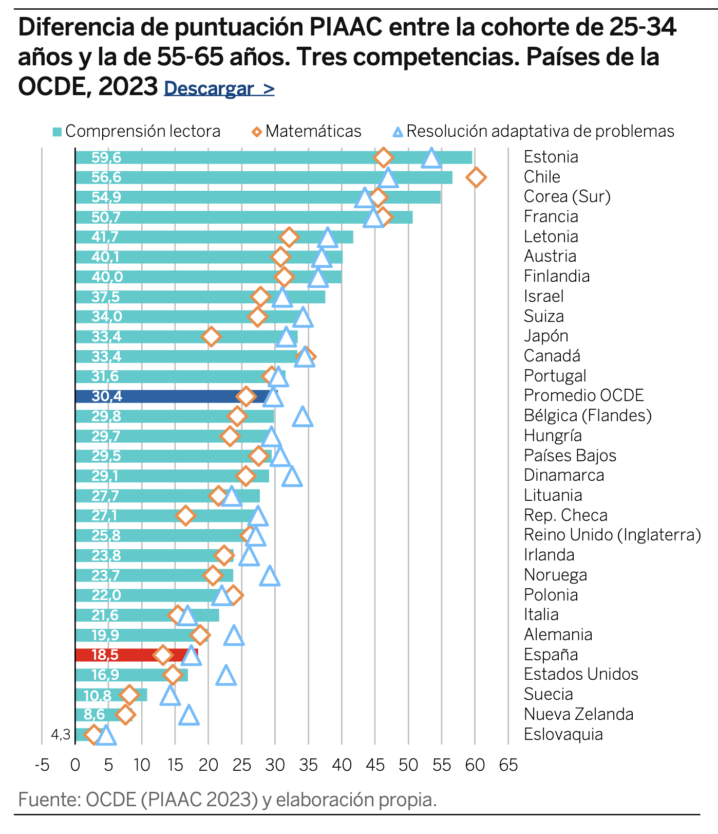 Las competencias en lectura del grupo de 25 a 34 años son solo 18,5 puntos superiores a las de los mayores (55 a 65 años), frente a un promedio de mejora de la OCDE de 30,4 puntos entre las dos cohortes; en matemáticas, las competencias han aumentado 13,2 puntos entre las dos generaciones, por debajo de los 25,7 puntos de media y, en resolución de problemas, la diferencia de 17,4 puntos en España contrasta con los 29,7 de la media. En las tres competencias, España se sitúa en el grupo de cola de los cinco países que menos han mejorado junto a Estados Unidos, Suecia, Nueva Zelanda y Eslovaquia.