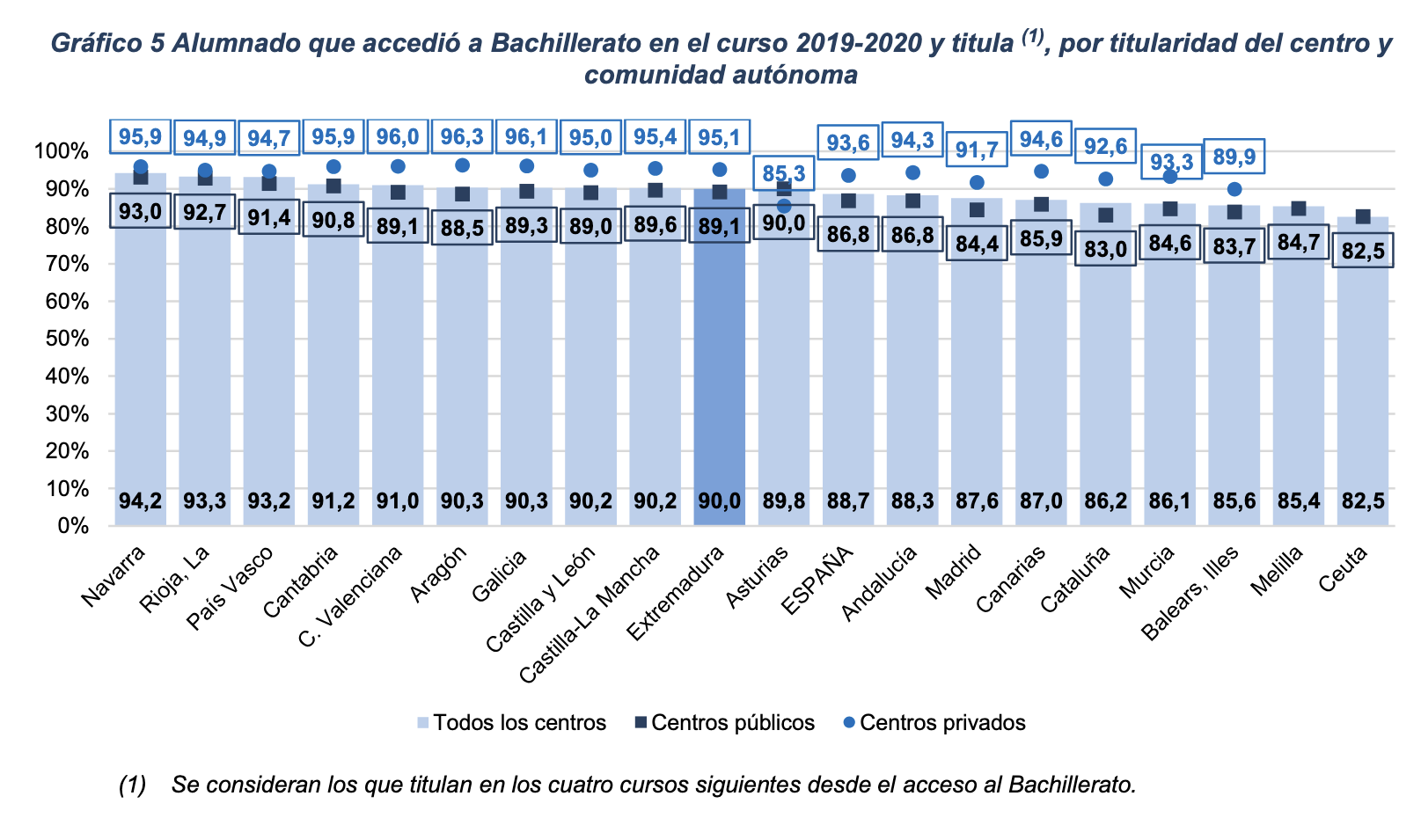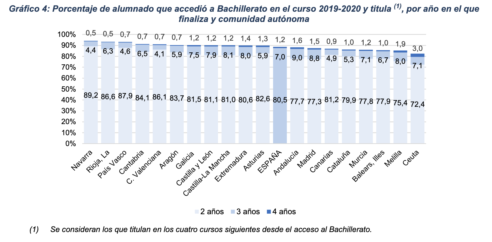 Según la última Estadística del seguimiento educativo y rendimiento académico del alumnado que accede a Bachillerato, ocho de cada diez estudiantes que empezaron este ciclo en 2019-20 titularon a los dos años mientras que un 7% lo hizo al tercer año y en el cuarto año lo hace un 1,2%. Las comunidades con mayores porcentajes de alumnado que consigue el título en dos años fueron la Comunidad Foral de Navarra (89%), País Vasco (88%), La Rioja (87%) y Comunidad Valenciana (86%). En el tercer año destaca el porcentaje de titulados de Andalucía (9%), Comunidad de Madrid (8,8%) y Castilla-La Mancha y Baleares (8%).
