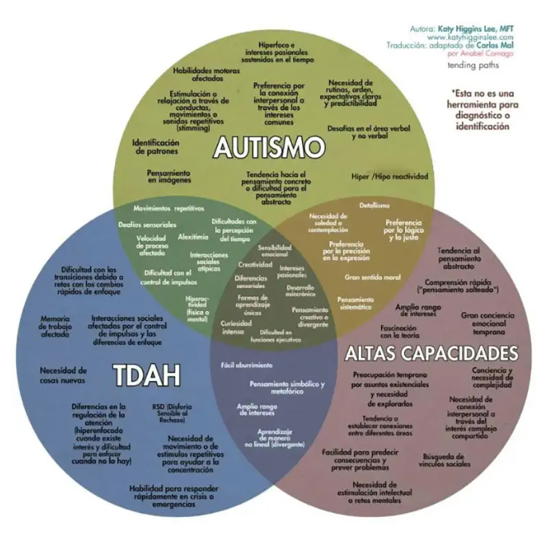 Hace tiempo que quería abordar el tema de la doble y de la triple excepcionalidad en las altas capacidades. Lo primero que hay que señalar es que un individuo que tiene altas capacidades no tiene por qué tener autismo y TDAH. Igualmente, alguien que tiene autismo no necesariamente tendrá altas capacidades y TDAH, así como también hay quienes tienen TDAH y creen tener, de manera errónea, autismo y altas capacidades, como en los dos casos anteriores mencionados.