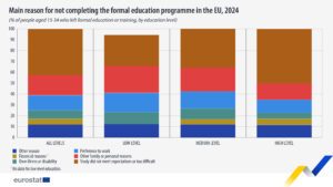 Las razones relacionadas con el programa educativo en sí varían según los niveles educativos: representaban el 28,7% en el nivel educativo bajo, el 35,9% en el nivel medio y un significativo 50,2% en el nivel alto. Sin embargo, las razones relacionadas con una enfermedad o discapacidad propia fueron más comunes en el nivel de educación inferior (11,1%) que en el nivel medio (9,8%) o alto (5,6%).