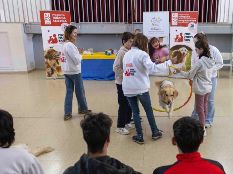 La primera demostración de la tercera edición de Momentos by Kiwoko se inició con un acercamiento de los alumnos a los perros a través de saludos, caricias y abrazos. “Cuanto más contacto haya con el perro, más se segregan hormonas como la oxitocina o endorfinas”, especifica Moreno Huerta. Después, con el juego, los alumnos trabajan múltiples áreas de su cerebro, como la parte cognitiva, social y comunicativa.