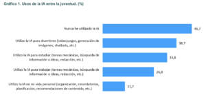 Entre quienes sí la han probado, el uso más extendido es con fines recreativos: el 38,7% recurre a la IA para actividades lúdicas, como videojuegos, generación de imágenes, chatbots, etc. Le siguen los usos educativos, presentes en el 33,8%, y los laborales, todavía minoritarios, con un 26,8% de jóvenes que la utilizan en tareas profesionales. La integración en la vida personal continúa siendo muy reducida: solo el 11,7% emplea la IA para organización, recordatorios, planificación o recomendaciones de contenido.