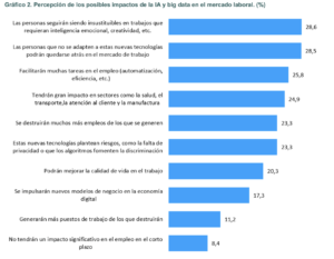Otras visiones apuntan a efectos tanto positivos como negativos: un 25,8% piensa que facilitarán muchas tareas en el empleo y un 24,9% que tendrán gran impacto en sectores como la salud, el transporte, la atención al cliente y la manufactura.