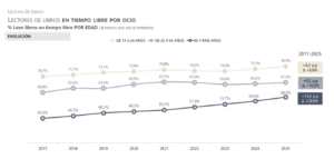 No ocurre lo mismo entre las diferentes edades, donde se va reduciendo poco a poco la distancia entre tramos. El estudio, además, continúa rompiendo el falso mito de que los jóvenes no leen. De hecho, la población entre 14 y 24 años es el que registra un mayor índice de lectores. El 76,9% se declara lector por ocio. Esto representa 1,6 puntos más que en 2024 y 6,2 puntos respecto a 2017. Siendo importante este crecimiento es menor que el alcanzado entre la población mayor de 65 años, que se declara lectora en tiempo libre y que llega al 58%, 2,4 puntos porcentuales más que en 2024 y 13 puntos más que en 2017. Este crecimiento podría estar relacionado con que esta franja de edad ya comienza a incorporar a aquellas generaciones de niños que fueron incorporándose a la enseñanza y pudieron ir adquiriendo el hábito lector.