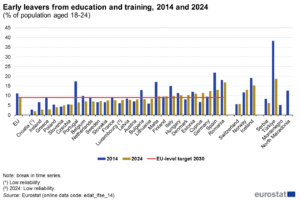 Sin embargo, el investigador de Funcas y profesor de la Universidad Rey Juan Carlos Ismael Sanz avisa de que la convergencia con la media europea «se ha ralentizado de forma notable». Incluso en el escenario previsto por Funcas, con una tasa del 12,5% en 2025, España seguiría situándose entre los países con mayor abandono escolar de la Unión Europea, solo por detrás de Rumanía, y aún lejos del objetivo europeo del 9% fijado para 2030. No obstante, España venía de tasas del entorno del 30% de abandono desde el año 2002, habiendo alcanzado un máximo histórico en 2004, con el 32,2%.