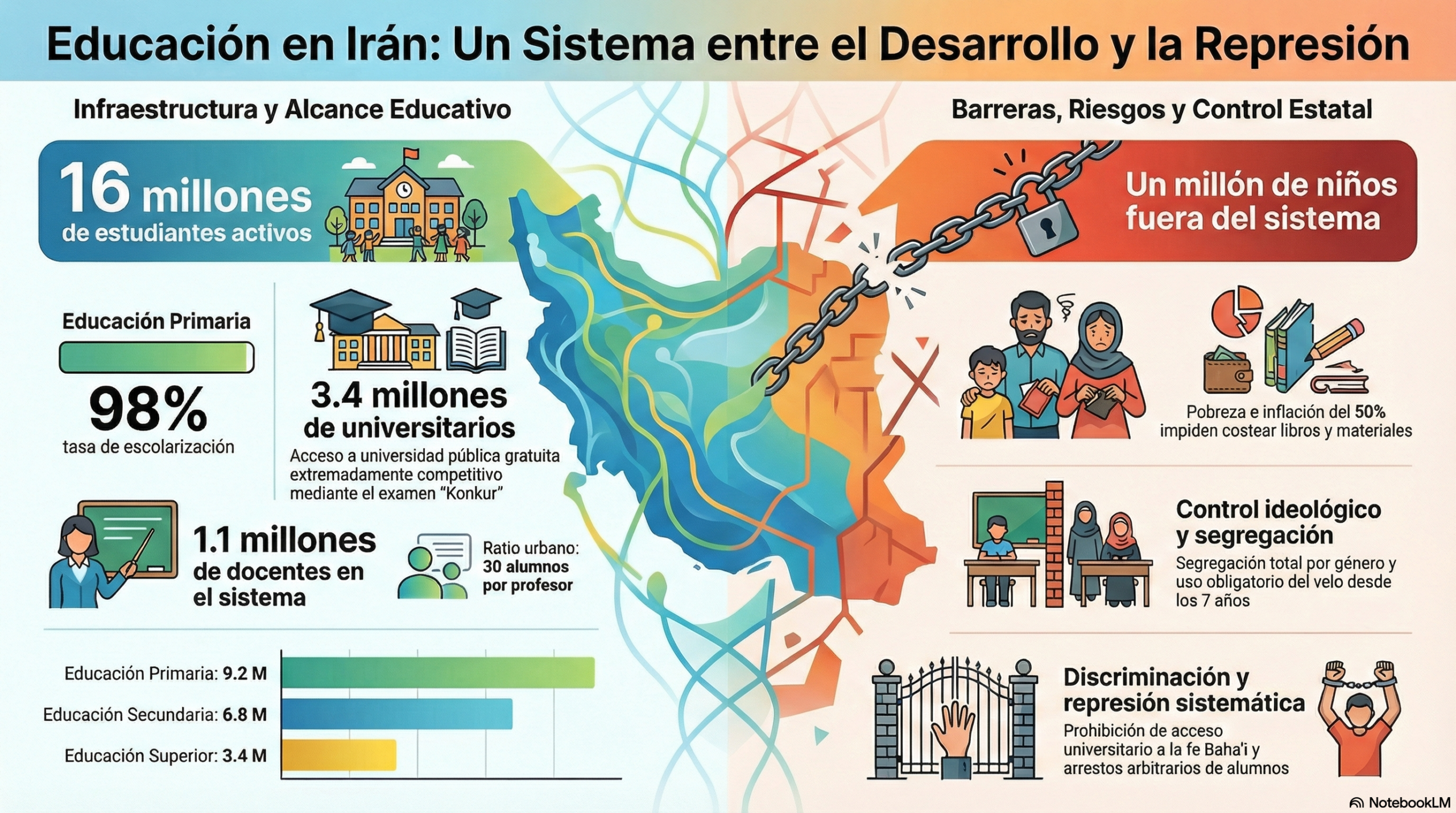Irán ha construido un sistema capaz de sostener masa escolar y un circuito universitario amplio, con herramientas de selección meritocrática y producción técnica en áreas estratégicas. Pero la misma arquitectura que impulsa capital humano también puede operar como filtro ideológico: controla contenidos, restringe el debate y penaliza la diferencia.