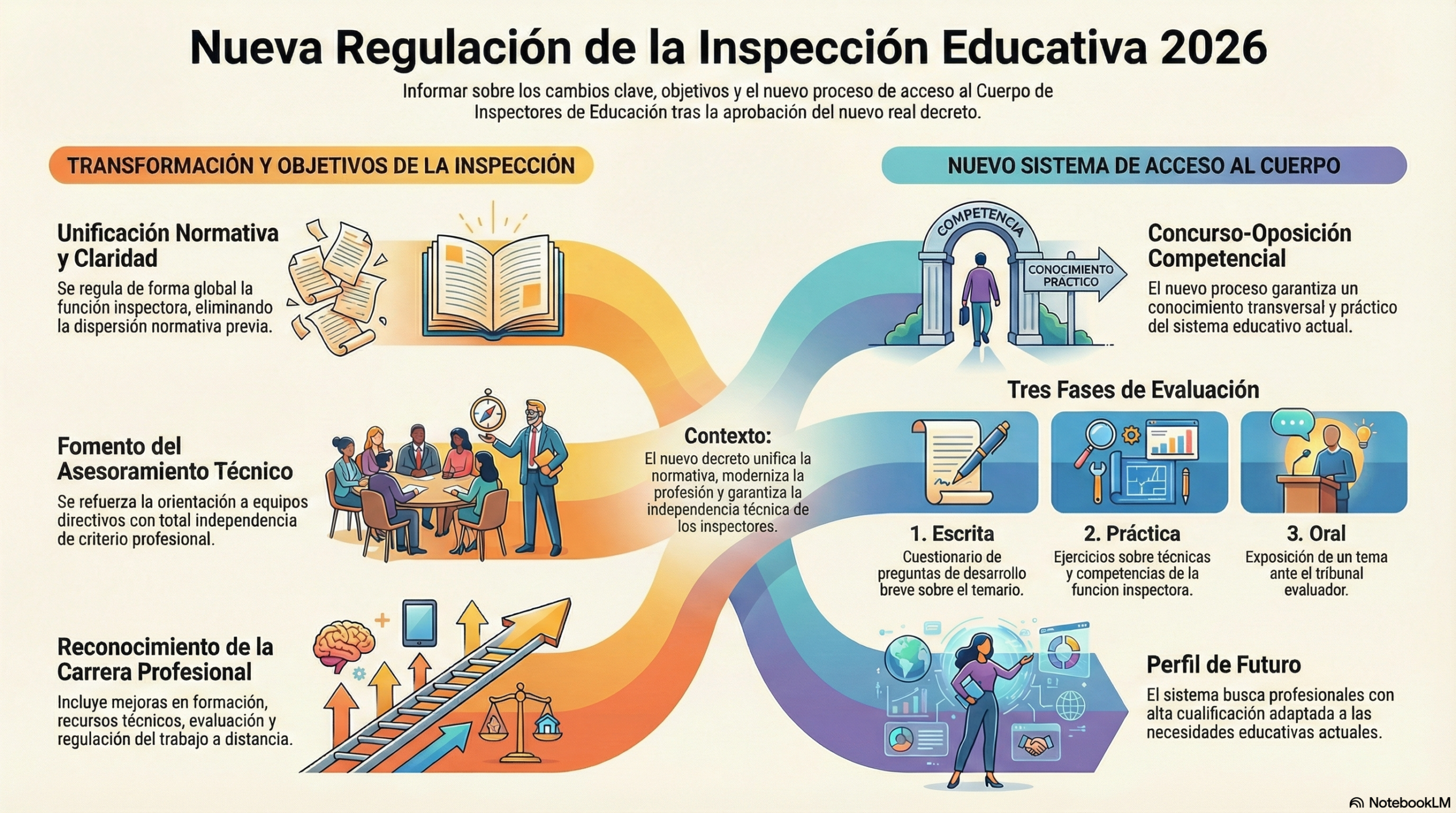 También se aprecia como un avance la actualización del sistema de acceso al Cuerpo de Inspectores de Educación. Mediante un proceso de concurso-oposición de carácter competencial, con pruebas orientadas a asegurar un conocimiento amplio y transversal del sistema educativo y de las técnicas propias de la función inspectora.