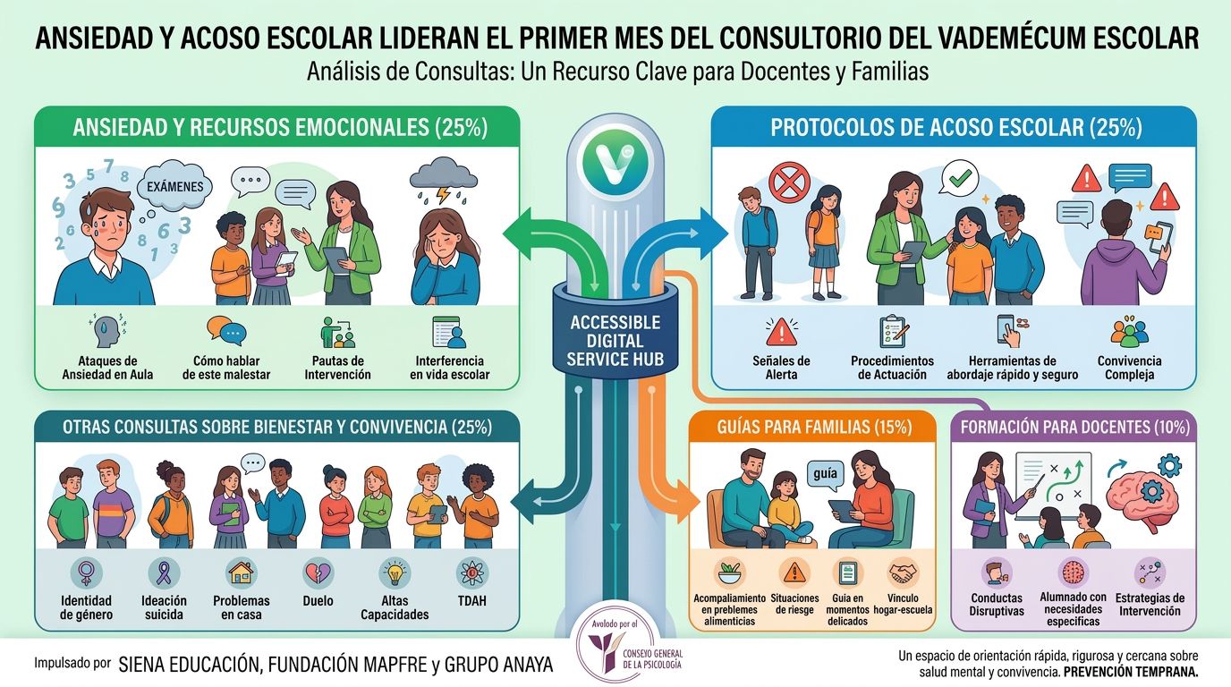 Las consultas más repetidas se reparten entre dos grandes bloques: los recursos para la ansiedad y los protocolos de acoso escolar, que concentran cada uno en torno al 25% de las solicitudes registradas durante el primer mes. El dato confirma que la salud emocional y la convivencia siguen siendo dos de las principales preocupaciones de los centros.