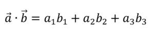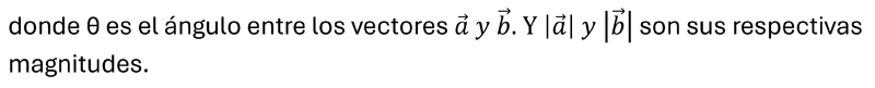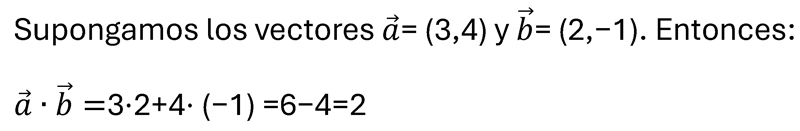 El producto escalar entre dos vectores tiene como resultado un número real. Este valor mide, en cierta forma, cuánto de un vector se proyecta en la dirección del otro. La fórmula más conocida es: