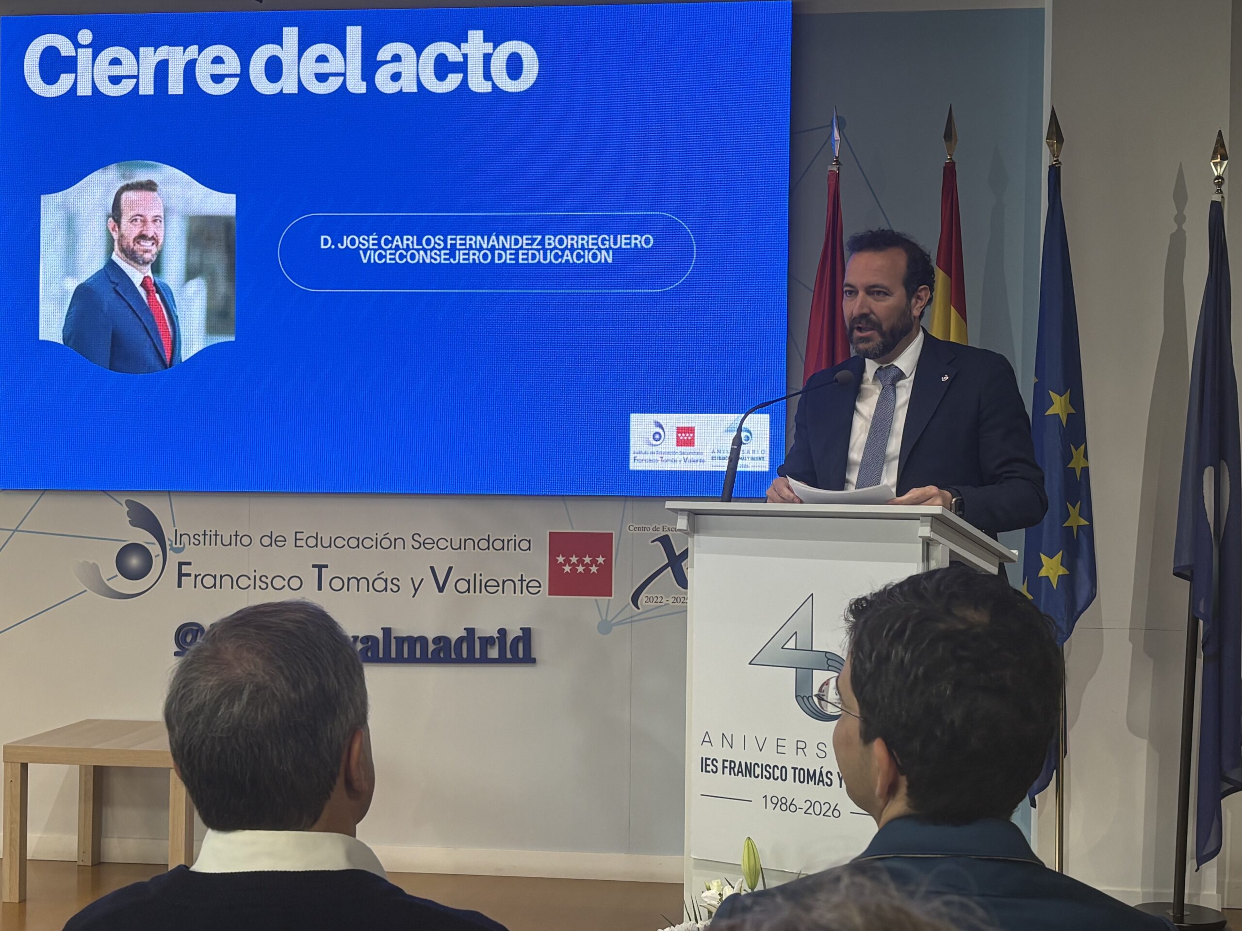 La clausura del acto ha corrido a cargo de José Carlos Fernández Borreguero, viceconsejero de Política Educativa de la Comunidad de Madrid, que ha felicitado al centro por sus 40 años de trayectoria y ha puesto en valor el papel de Tomás Alonso, al que ha reconocido su huella educativa durante estas tres décadas al frente del instituto. Su intervención ha querido destacar también la apuesta del centro por la innovación, la investigación aplicada, la internacionalización y el emprendimiento.