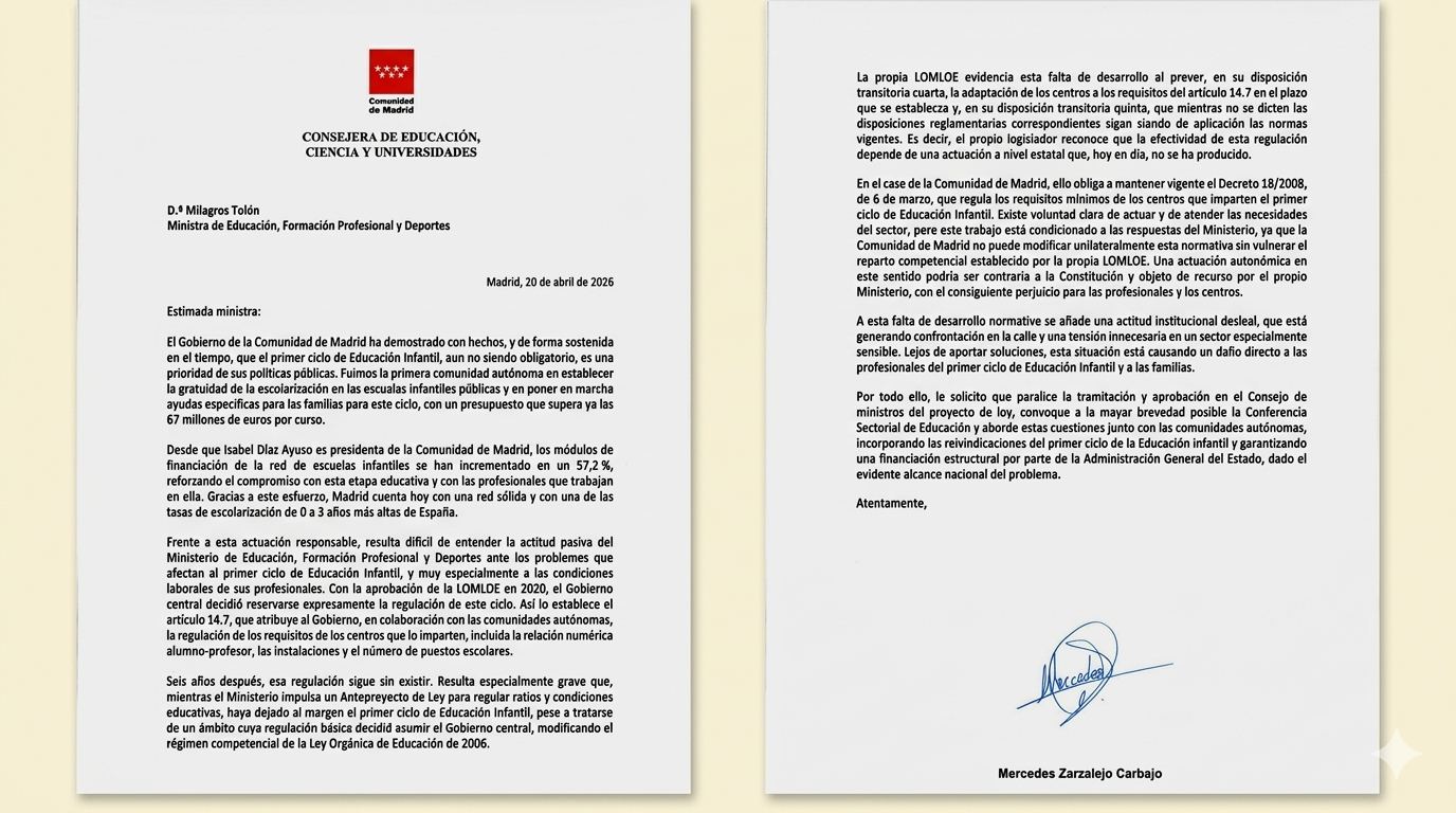 A esta falta de desarrollo normativo se añade, continúa la consejera, una «actitud institucional desleal que está generando confrontación en la calle», continúa Zarzalejo en alusión a la huelga indefinida de las educadoras que comenzó el 7 de abril acompañada de concentraciones y protestas. Por eso, la consejera pide a la ministra «que paralice la tramitación y aprobación en el Consejo de Ministros del proyecto de ley», y convoque la mejor brevedad posible la Conferencia Sectorial de educación y aborde estas cuestiones junto con las comunidades.