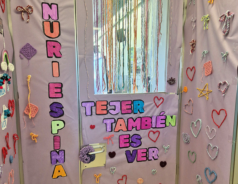 Actividad realizada en el aula con alumnado de 1º de ESO con motivo del Día de la Mujer. "Dedicamos la decoración a una mujer tejedora ciega de Alicante. El alumnado creó cadenetas de crochet para intervenir la puerta del aula y una alumna, también ciega, escribió en braille el mensaje: “tejer también es ver”. La propuesta parte de una idea sencilla: utilizar el tejido como herramienta para trabajar la inclusión, la atención y la sensibilidad hacia otras realidades".
