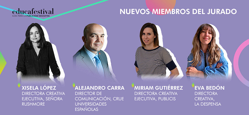 Estas nuevas incorporaciones formarán el jurado de la nueva edición de Educafestival junto con los jurados ya anunciados con anterioridad: Germán Silva, fundador y CEO de la agencia Pink; Toni Garrido, de Sonora; Begoña Vaquero, coordinadora Comunicación y Marketing de Colegios 3A; y Pepe Vilches, director de Innovación de Sigma en Europa (Campofrío Food Group).