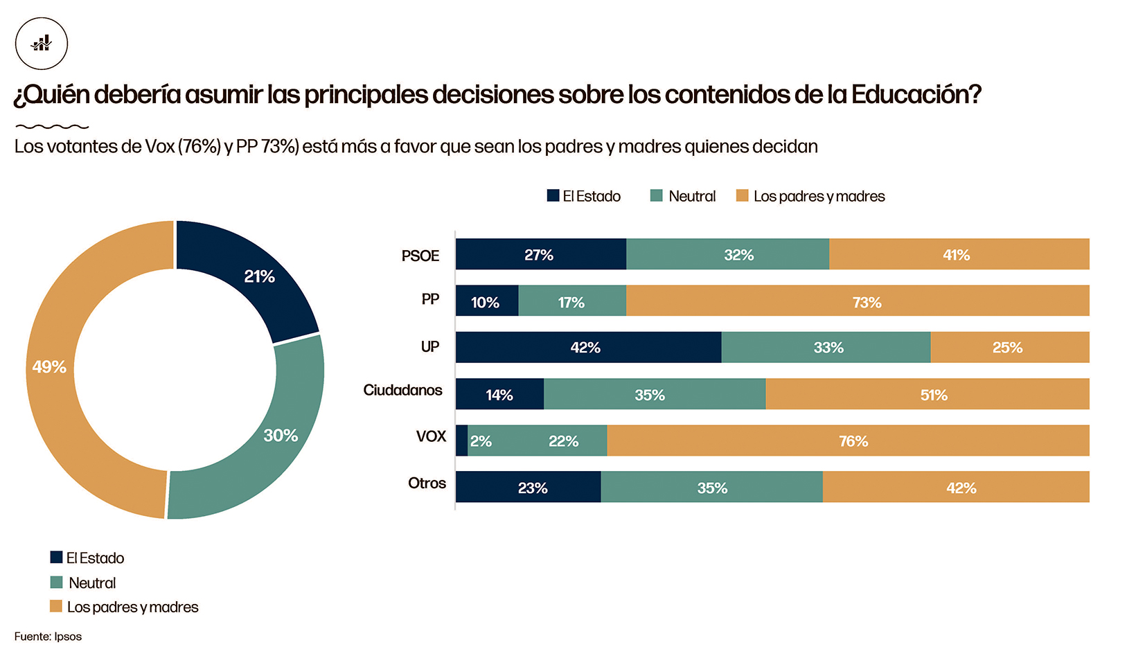 Los votantes de Vox (76%) y PP (73%) están más a favor de que sean los padres. Para el 41% de los votantes del PSOE, también los padres y el 27% el Estado. Entre el 42% de los votantes de Unidas Podemos, el Estado debe ser el principal decisor, según una encuesta de Ipsos.