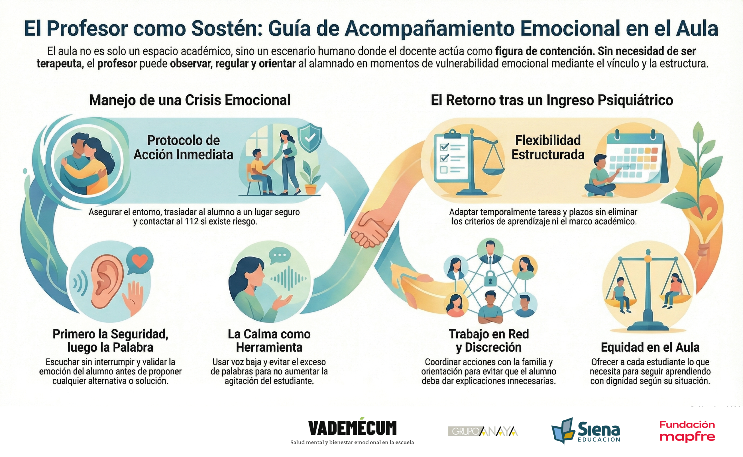 La novena entrega del "Vademécum de salud mental y bienestar emocional en la escuela" se adentra en el territorio más delicado de la vida docente: el momento en que una crisis emocional irrumpe en clase, cuando no hay pautas claras tras un ingreso psiquiátrico, cuando hace falta acercarse sin invadir y, al mismo tiempo, poner límites con serenidad. El capítulo convierte el aula en un lugar de observación, vínculo y regulación, y recuerda que enseñar también es sostener sin romper el equilibrio pedagógico.