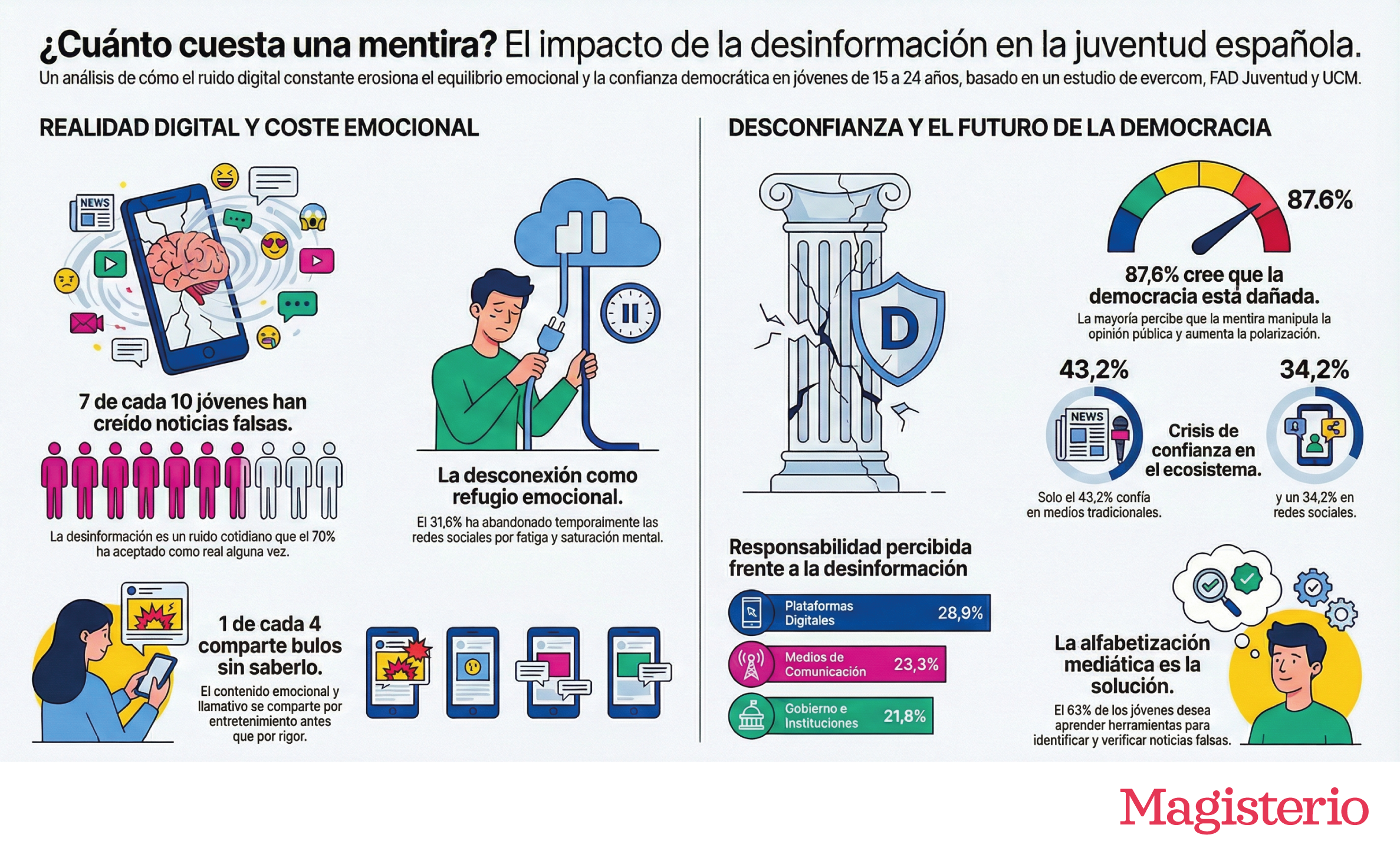 El informe "¿Cuánto cuesta una mentira?" retrata a una generación que vive informada por pantallas, pero también fatigada por el exceso de ruido, la duda constante y la erosión de la confianza. Elaborado por evercom junto con FAD Juventud y la Universidad Complutense de Madrid, el estudio analiza a 800 jóvenes de entre 15 y 24 años en España y dibuja una cronica de fondo sobre bienestar, medios y democracia